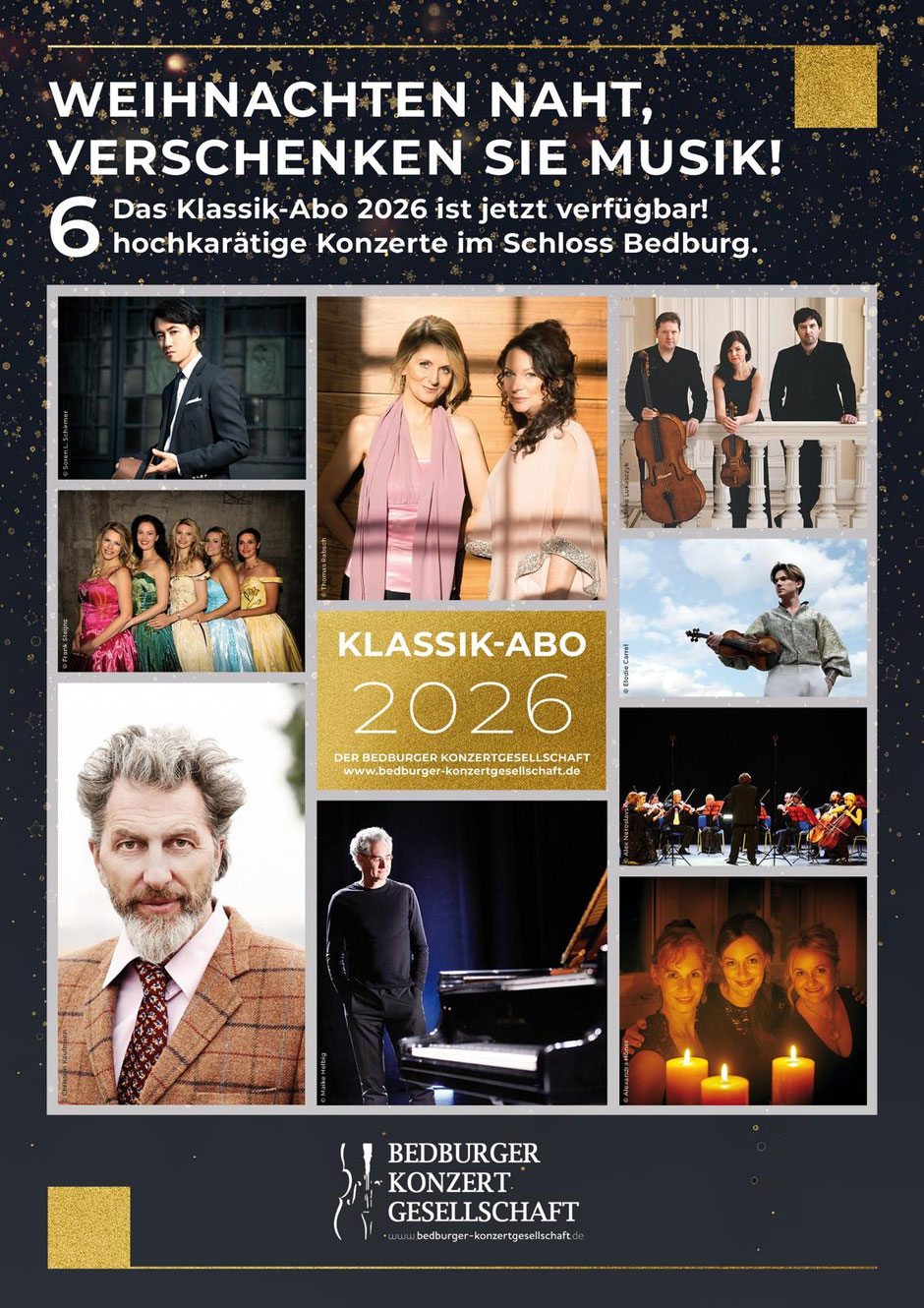 Die Bedburger Konzertgesellschaft bietet ein Konzertprogramm mit insgesamt fünf bis sieben Konzerten pro Saison. Ein großer interessierter Abonnentenstamm unterstützt die finanzielle Planung.